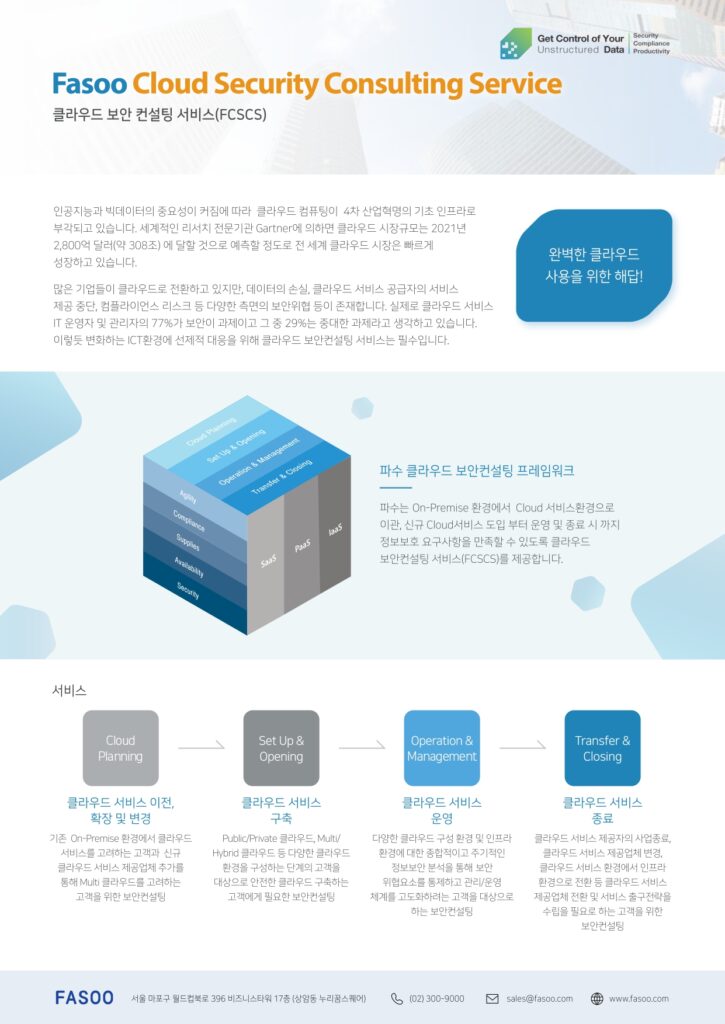 Fasoo는 On-Premise 환경에서 클라우드 서비스 환경으로 이관, 신규 클라우드 서비스 도입부터 운영 및 종료 시까지 정보보호 요구사항을 만족할 수 있도록 클라우드 보안컨설팅 서비스(FCSCS)를 제공합니다.
