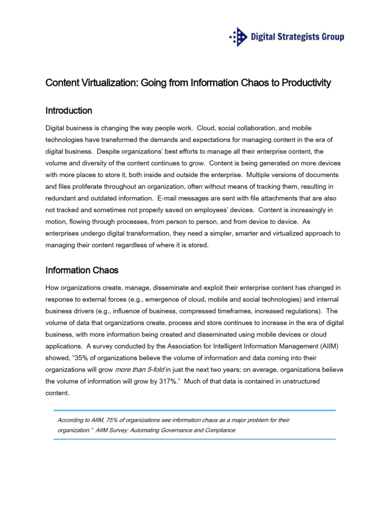 Digital business is changing the way people work. Cloud, social collaboration, and mobile technologies have transformed the demands and expectations for managing content in the era of digital business. Despite organizations’ best efforts to manage all their enterprise content, the volume and diversity of the content continues to grow. Content is being generated on more devices with more places to store it, both inside and outside the enterprise. Multiple versions of documents and files proliferate throughout an organization, often without means of tracking them, resulting in redundant and outdated information. E-mail messages are sent with file attachments that are also not tracked and sometimes not properly saved on employees’ devices. Content is increasingly in motion, flowing through processes, from person to person, and from device to device. As enterprises undergo digital transformation, they need a simpler, smarter and virtualized approach to managing their content regardless of where it is stored.