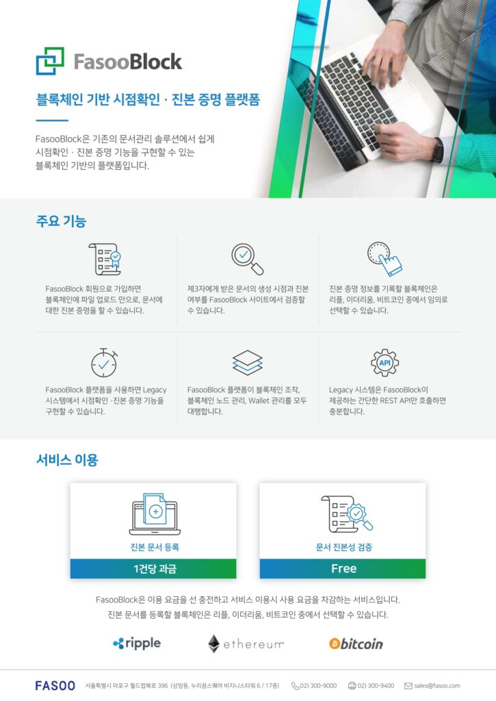 FasooBlock은 이용 요금을 선 충전하고 서비스 이용시 사용 요금을 차감하며, 진본 문서를 등록할 블록체인은 리플, 이더리움, 비트코인 중에서 선택할 수 있습니다.