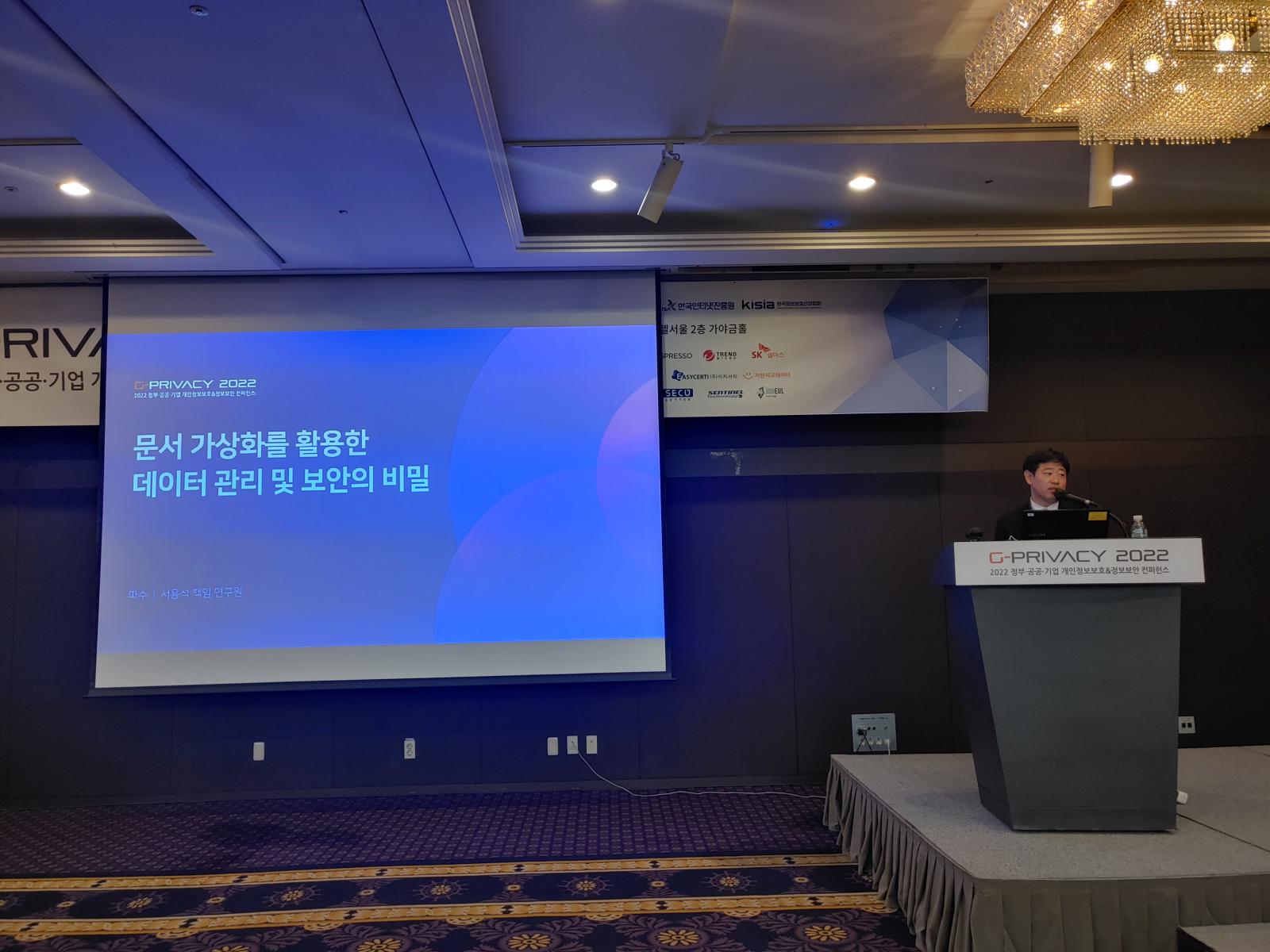 코로나 시국이 장기화됨에도 불구하고, 올해 첫 오프라인 행사로 진행된 G-Privacy 2022 행사에 많은 참관객들이 운집하며 성황을 이뤘습니다. 파수는 이날 서용석 책임연구원이 <문서 가상화를 활용한 데이터 관리 및 보안의 비밀>이라는 세션 발표를 진행하며, 상당수 고객들이 뜨거운 관심을 받았고, 부스에서는 최신 보안 트렌드를 총망라하며 다양한 고객들의 궁금증을 해소하는데 많은 노력을 기울였습니다.