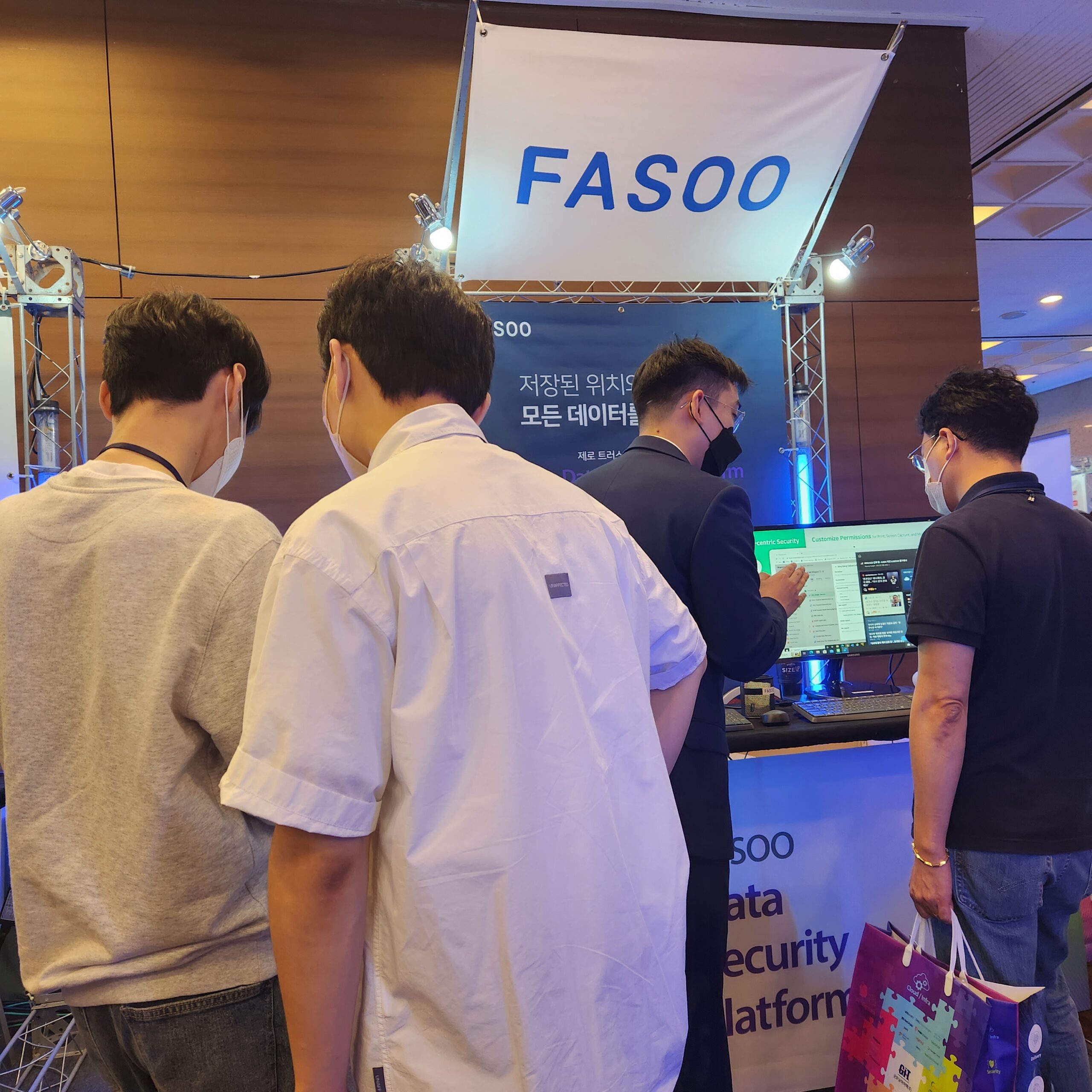 부스에서는 Fasoo Data Security Platform의 핵심 솔루션들인 문서 가상화 솔루션 Wrapsody, 외부 협업 솔루션 Wrapsody eCo, 데이터 식별 및 분류 솔루션 FDR을 소개시켜드리며, 고객분들의 많은 관심을 받았습니다.