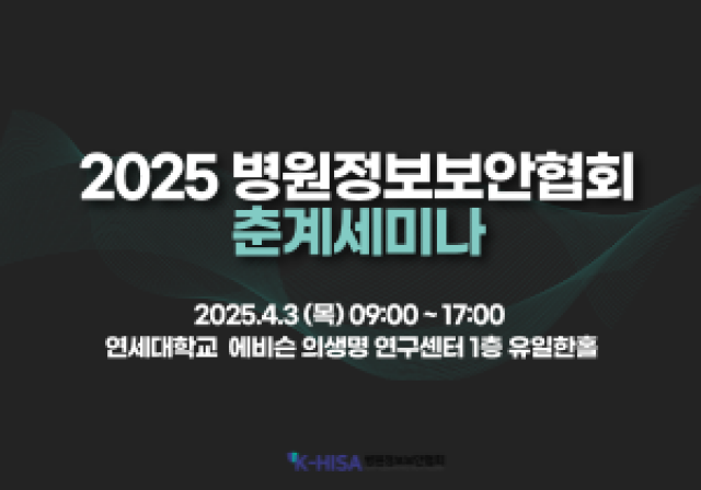 2025년 병원정보보안협회 춘계학술세미나 (HIS-Con 2025) 파수가 4월 3일(목) 세브란스병원 에비슨홀에서 개최되는 2025년 병원정보보안협회 춘계학술세미나에 참가합니다. 부스를 통해 스마트 의료환경 시대에 최적화된 보안 혁신 전략을 소개합니다. <행사 개요> 2025.03.25