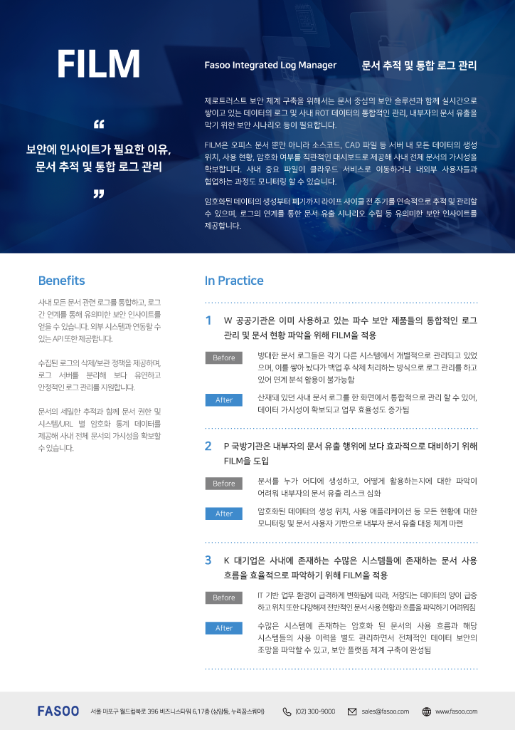 FILM은 문서의 최초 생성부터 폐기까지 모든 사용 이력을 추적하는 제품입니다. 오피스 문서 뿐만 아니라 소스코드, CAD 파일 등 서버 내 모든 데이터의 생성 위치, 사용 현황, 암호화 여부를 직관적인 대시보드로 제공해 사내 전체 데이터의 가시성을 확보합니다.