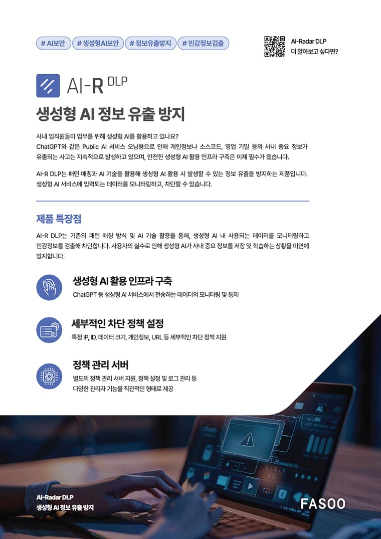 AI-R DLP는 패턴 매칭과 AI 기술을 활용해 생성형 AI 활용 시 발생할 수 있는 정보 유출을 방지하는 제품입니다. 생성형 AI 서비스에 입력되는 데이터를 모니터링하고, 차단할 수 있습니다.