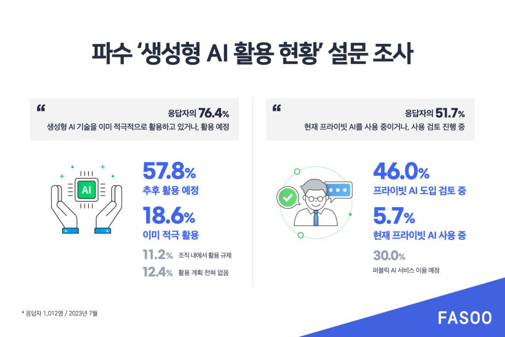 파수, 1,012명 대상 ‘생성형 AI 활용 현황’ 설문 진행 파수가 국내 기업·기관의 보안, IT 담당자 등을 대상으로 ‘기업 및 기관의 생성형 AI 활용 현황’ 설문조사를 실시했습니다. 챗GPT로 가속화되고 있는 생성형 AI의 활용 현황과 2023.08.21