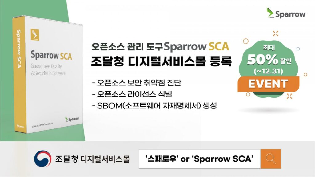 스패로우, 오픈소스 관리 도구 ‘Sparrow SCA’ 조달청 디지털 서비스몰 등록 스패로우는 오픈소스 관리 도구인 ‘Sparrow SCA v1.6’을 조달청 디지털 서비스몰에 등록하고, 이를 기념한 프로모션을 연말까지 진행합니다. Sparrow SCA v1.6는 조달청 디지털 서비스몰에 등록된 최초의 2022.10.13
