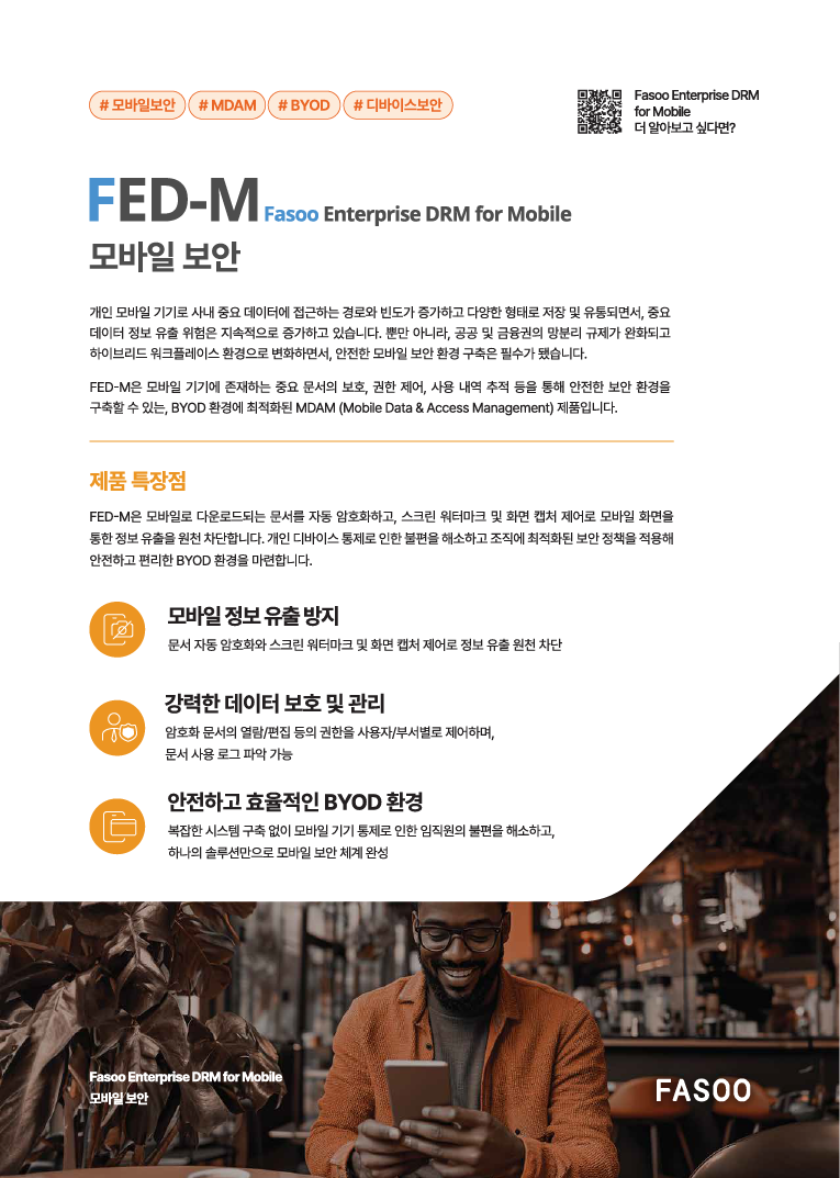 FED-M은 모바일 기기에 존재하는 중요 문서의 보호, 권한 제어, 사용 내역 추적 등을 통해 안전한 보안 환경을 구축할 수 있는, BYOD 환경에 최적화된 MDAM (Mobile Data & Access Management) 제품입니다.