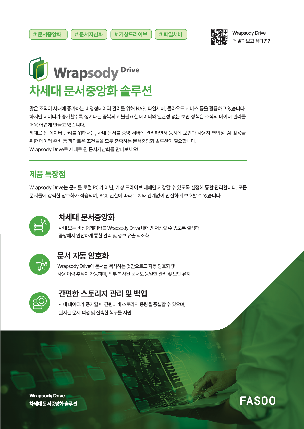 위한 데이터 준비 등 까다로운 조건들을 모두 충족하는 문서중앙화 솔루션이 필요합니다. Wrapsody Drive로 제대로 된 문서자산화를 만나보세요!