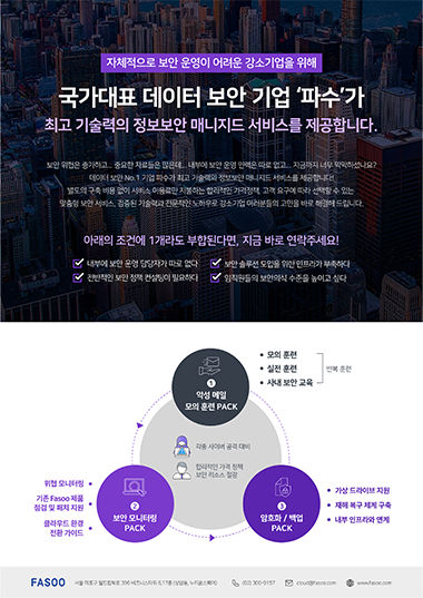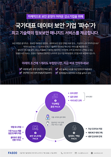 Fasoo의 정보보안 매니지드 서비스는 제각기 다른 환경에서 보안 관련 어려움과 고민을 마주하고 있는 고객분들을 위해 시작됐습니다. 보안 인력 및 인프라 이슈, 보안 의식 부족, 취약점 파악의 어려움 등 다양한 보안 문제를 겪고 있는 조직의 보안 점검 및 운영을 대행하는 서비스를 제공합니다.