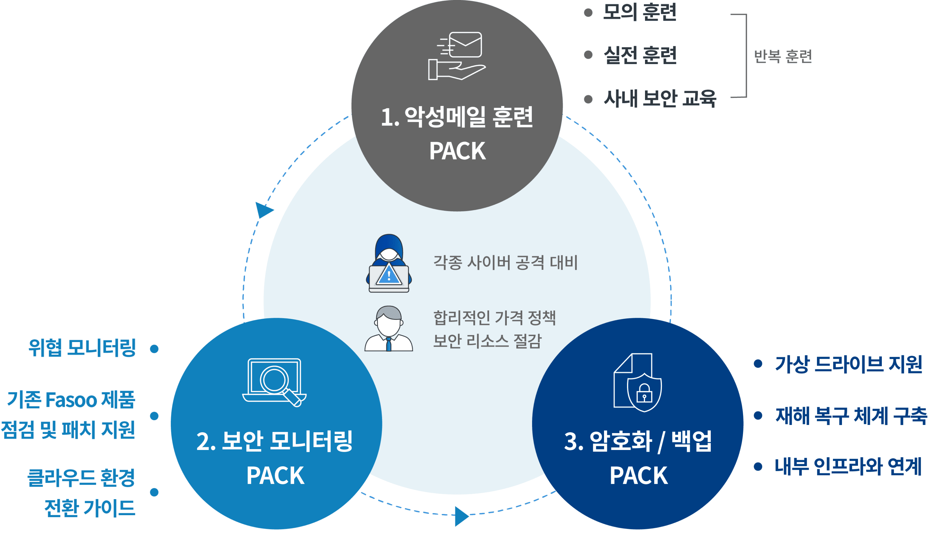 기존 Fasoo 제품의 점검 및 패치 지원과 함께, 클라우드 기반 업무 환경으로의 전환을 돕습니다. 또한, 효율적인 보안 제품 모니터링을 통해 보안 관련 리소스를 최소화 합니다.