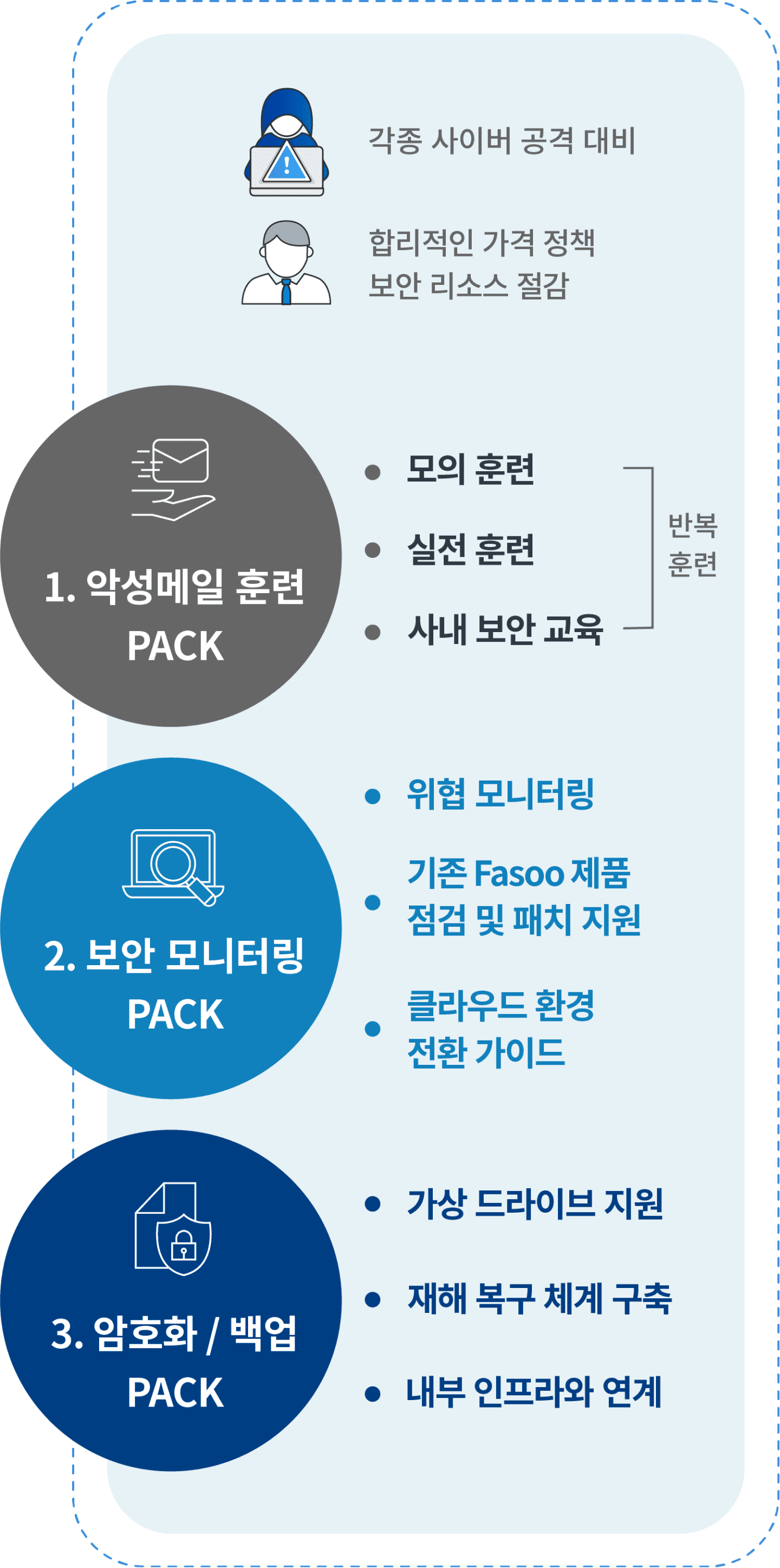 Fasoo 정보보안 매니지드 서비스는 고객사의 규모, 비즈니스 환경에 관계 없이 안전하면서도 효율적인 보안 서비스를 제공합니다. 보안을 위해 반드시 필요한 서비스만을 제공해, 비용이나 리소스를 최소화 한 맞춤형 보안 서비스를 이용할 수 있습니다.