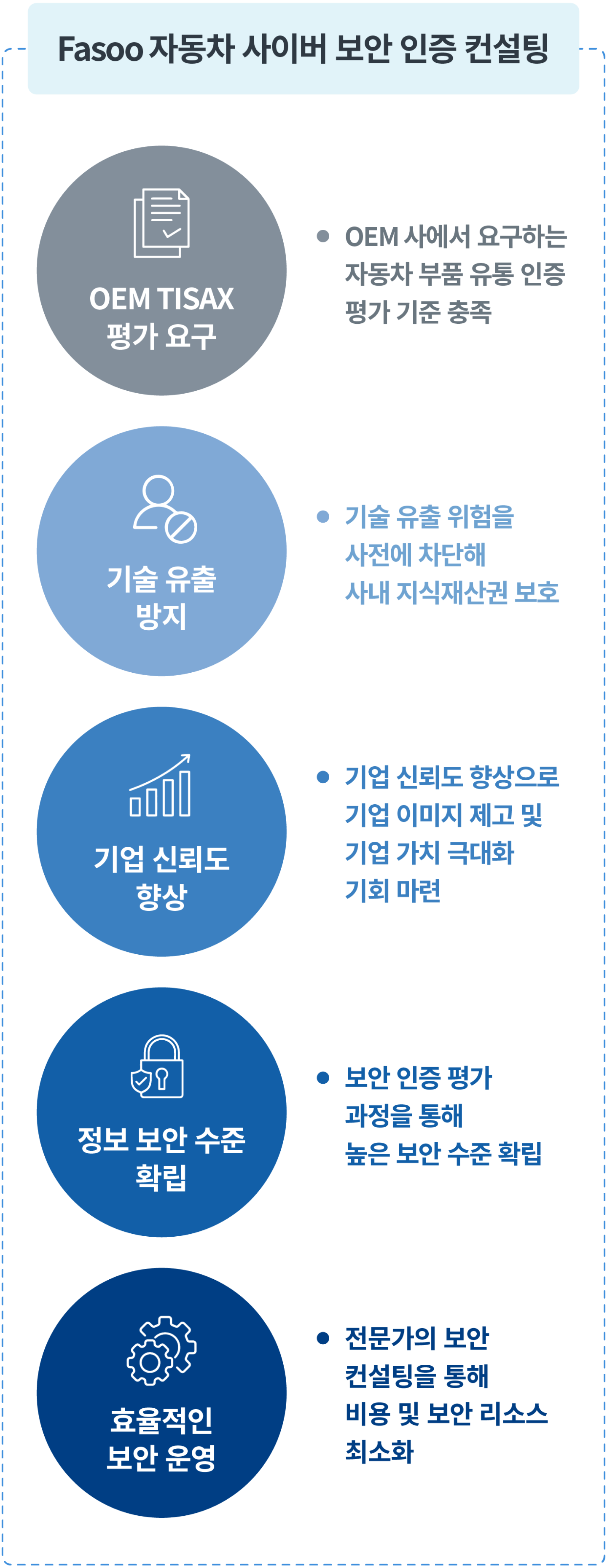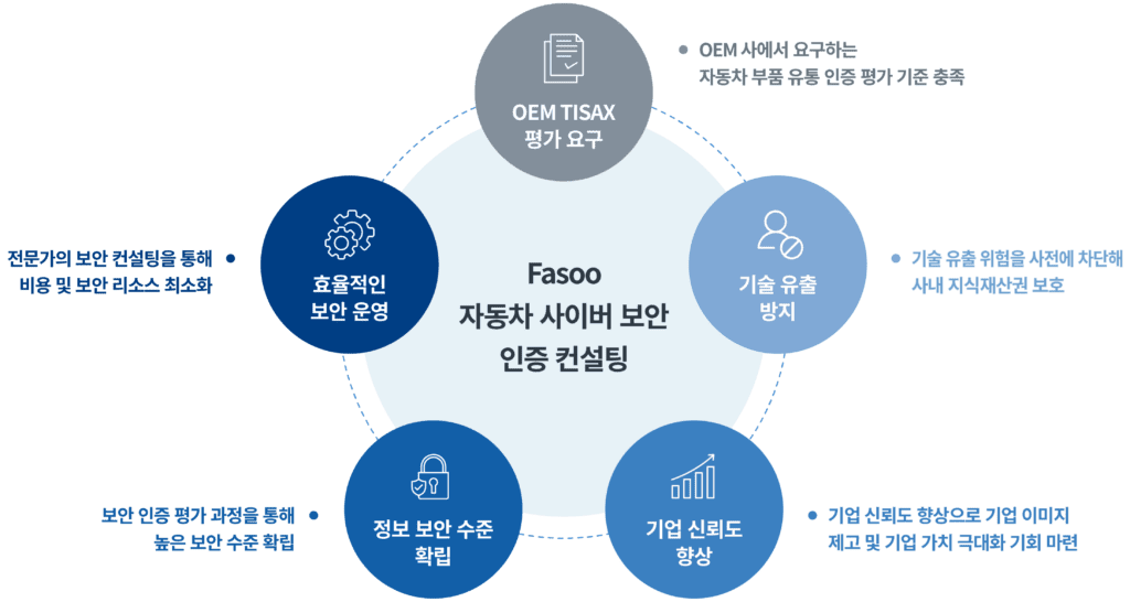 Fasoo의 자동차 사이버 보안 인증 서비스는 VDA-ISA가 요구하는 보안 수준 확보를 위해, 인증 준비부터 라벨 획득까지 전 과정에 걸친 보안 컨설팅을 제공합니다.