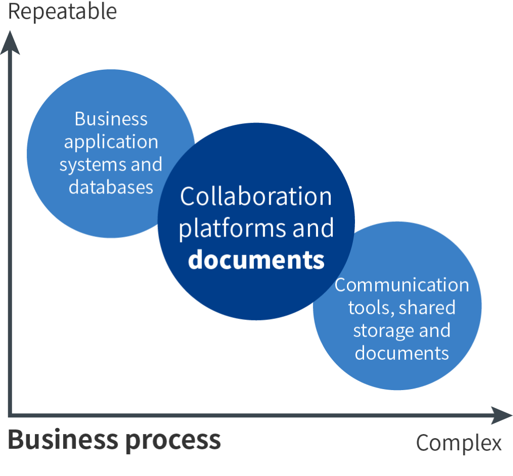 대부분의 기업 및 기관들은 이미 여러 종류의 협업 솔루션들을 사용하고 있습니다. 비디오 컨퍼런스, 다자간 통화, 메신저, 이메일 등 여러 협업 툴들을 활용하고 있지만, 이 모든 커뮤니케이션 중심인 ‘문서’로 인해 문제가 발생합니다. 문서들이 여러 협업 솔루션을 통해 협업 과정에서 활용되며 중복되고 불필요한 데이터들을 만들어내기도 하고, 보안 정책에도 일관성을 적용하기가 어려워 데이터 보호와 효율적인 업무 진행을 저해하는 주요 요인이 되고 있습니다.