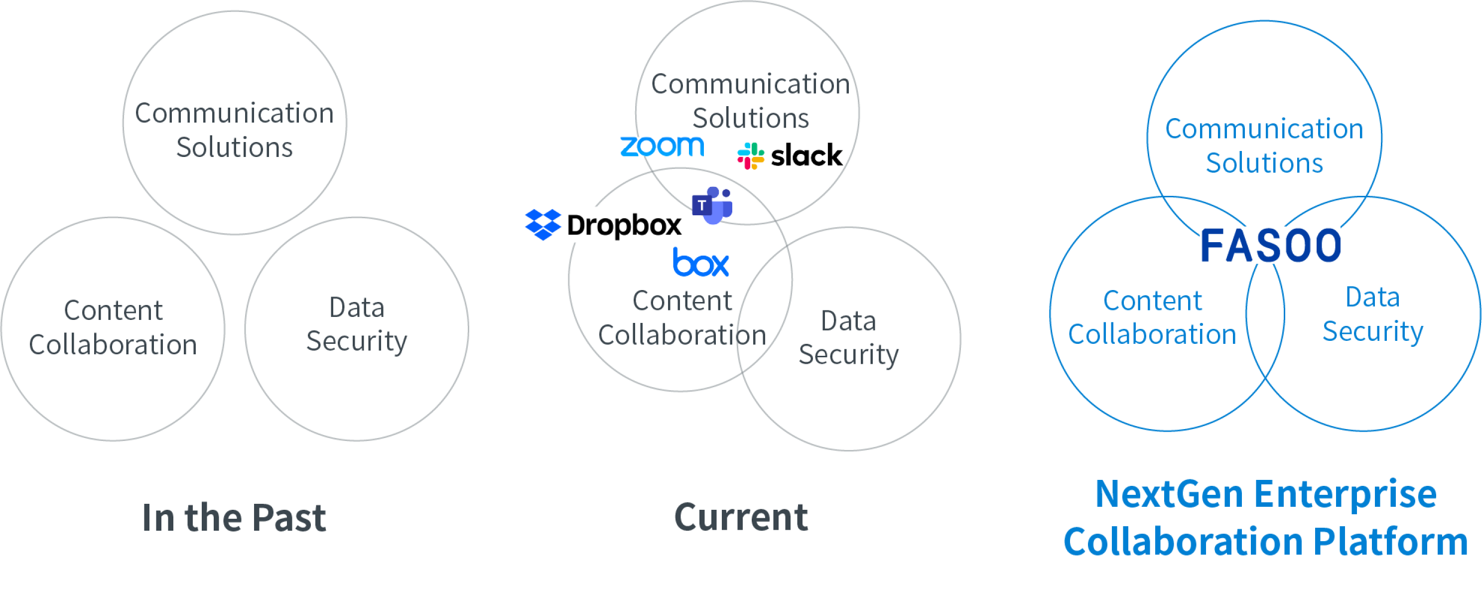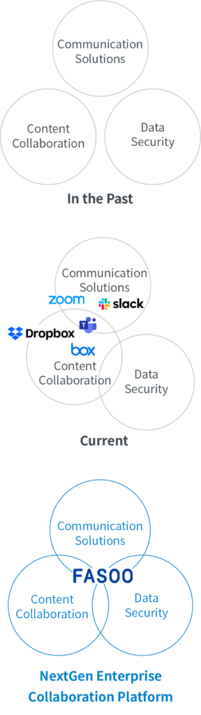 Fasoo의 차세대 협업 플랫폼은 효율적인 커뮤니케이션, 문서 중심 협업, 데이터 보안으로 구성됩니다. 조직은 이 플랫폼을 통해 커뮤니케이션 채널을 통합해 워크그룹 기반 협업 환경을 혁신적으로 개선하고, 원격 근무 환경에서도 업무 PC나 노트북에서 작업하는 문서들에 대해 회사에서와 같이 일관된 보안 정책을 적용해 안전한 업무 환경을 구축할 수 있습니다. 또한, 시스템이 아닌 문서 중심의 협업 기능, 사내/사외 자유로운 워크그룹 구성과 이에 기반한 문서 공유, 가상화된 문서 구조로 통일된 가상 업무 환경 구성이 가능합니다.