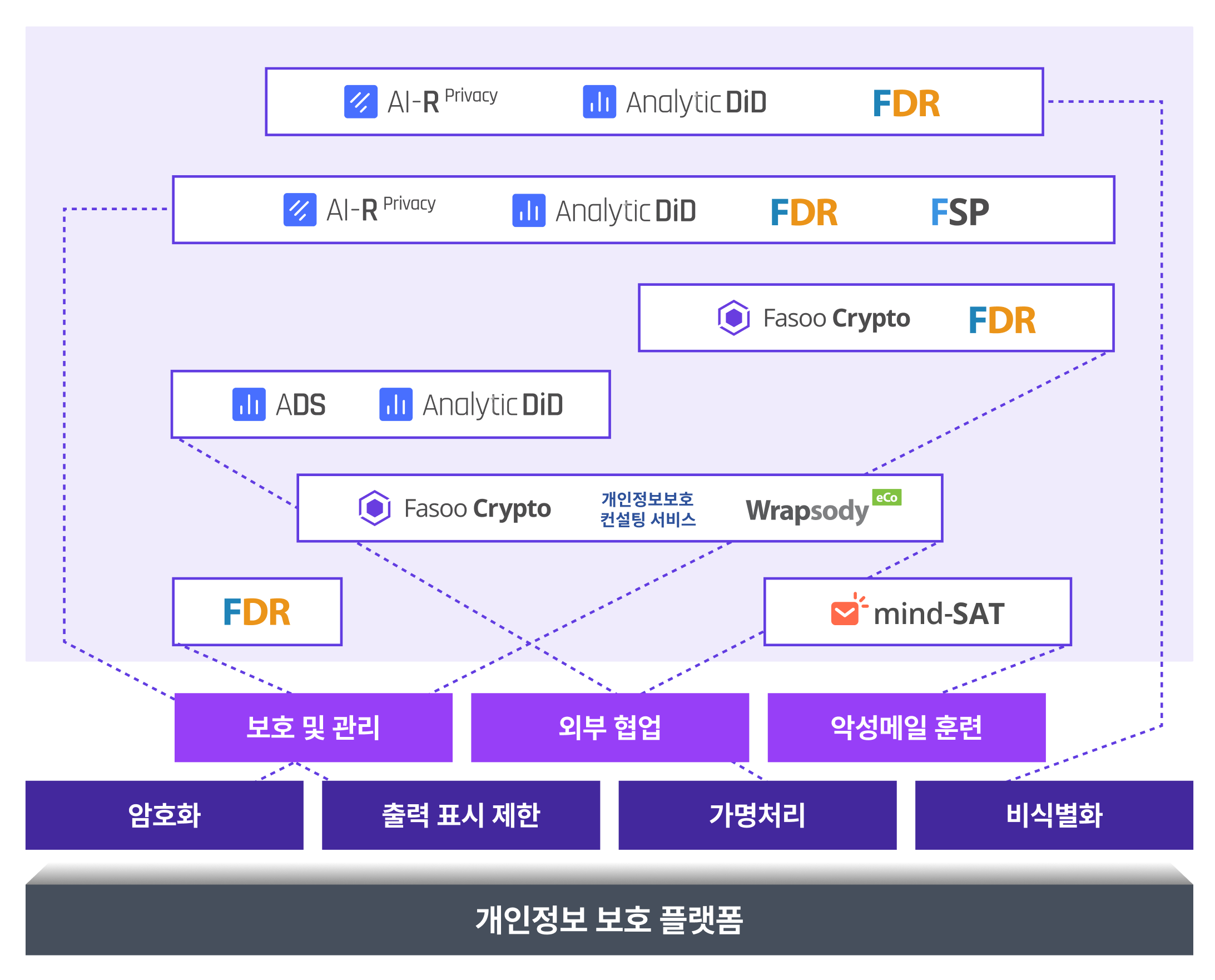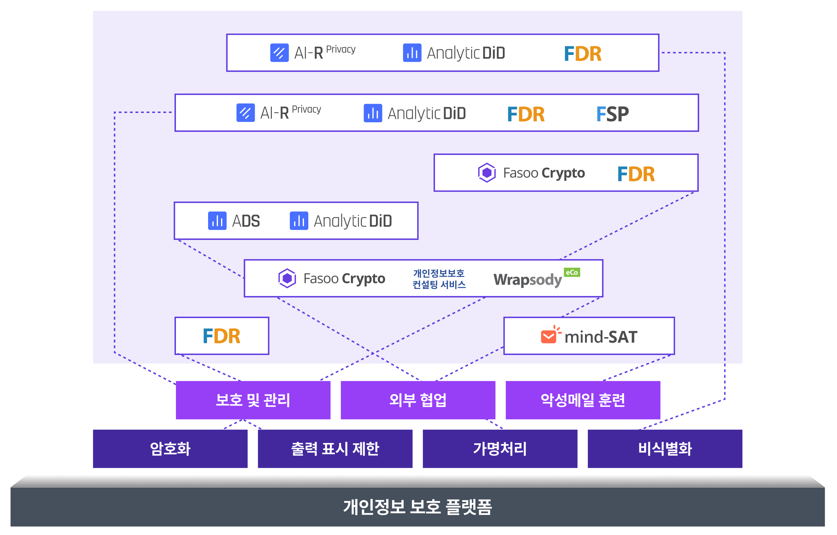 Fasoo의 개인정보보호 및 활용 솔루션은 개인정보가 포함된 데이터를 안전하게 보호하면서 효율적으로 활용할 수 있는 환경을 제공합니다. 데이터의 식별 및 분류를 통해 개인정보를 실시간으로 검출 및 추적 관리하며, PC, 서버, 출력물, 화면 등 다양한 경로에서 발생할 수 있는 개인정보 유출을 차단합니다. 또한, 관련 컴플라이언스를 철저히 준수하고 개인정보를 비식별화 및 가명 처리해 안전하게 보호된 상태로 관리합니다. 이를 통해 기업 및 기관이 개인정보를 효과적으로 활용해 새로운 비즈니스 기회를 창출할 수 있도록 지원합니다.