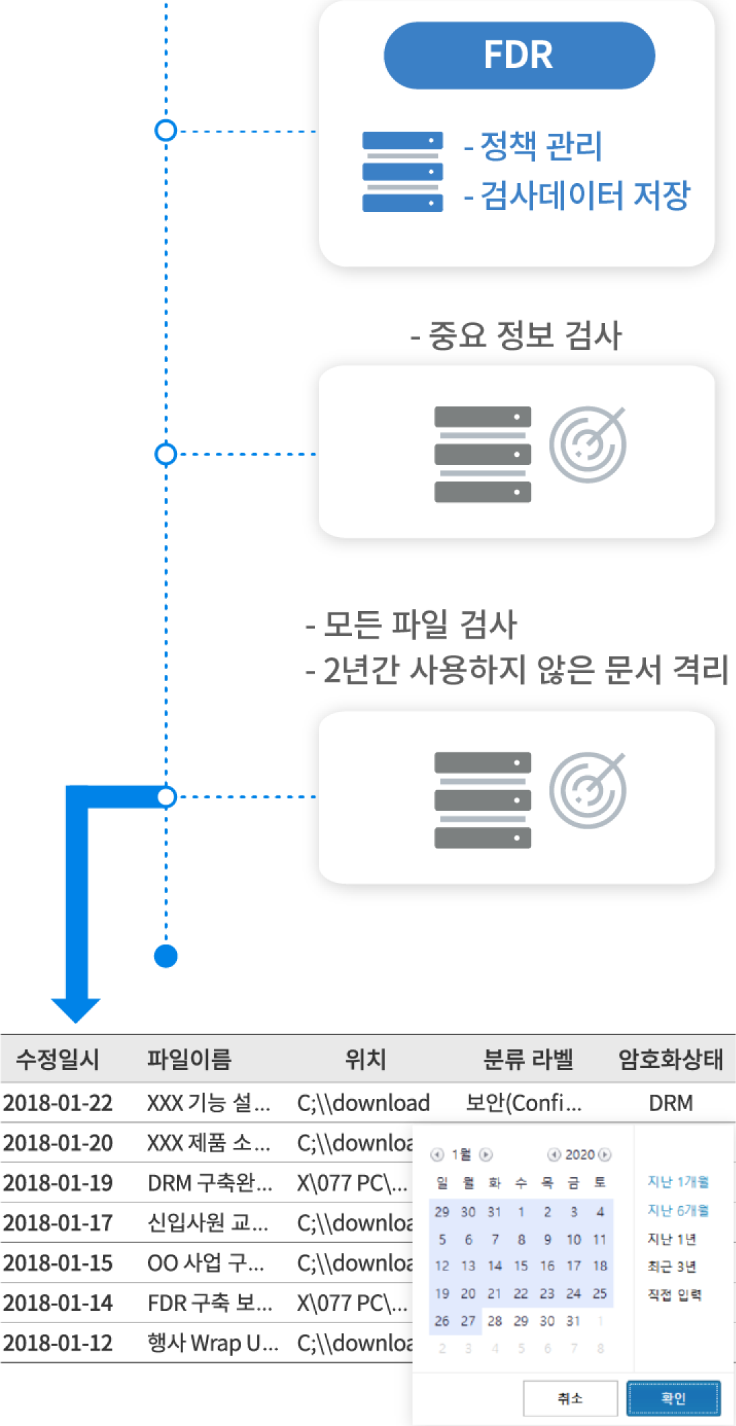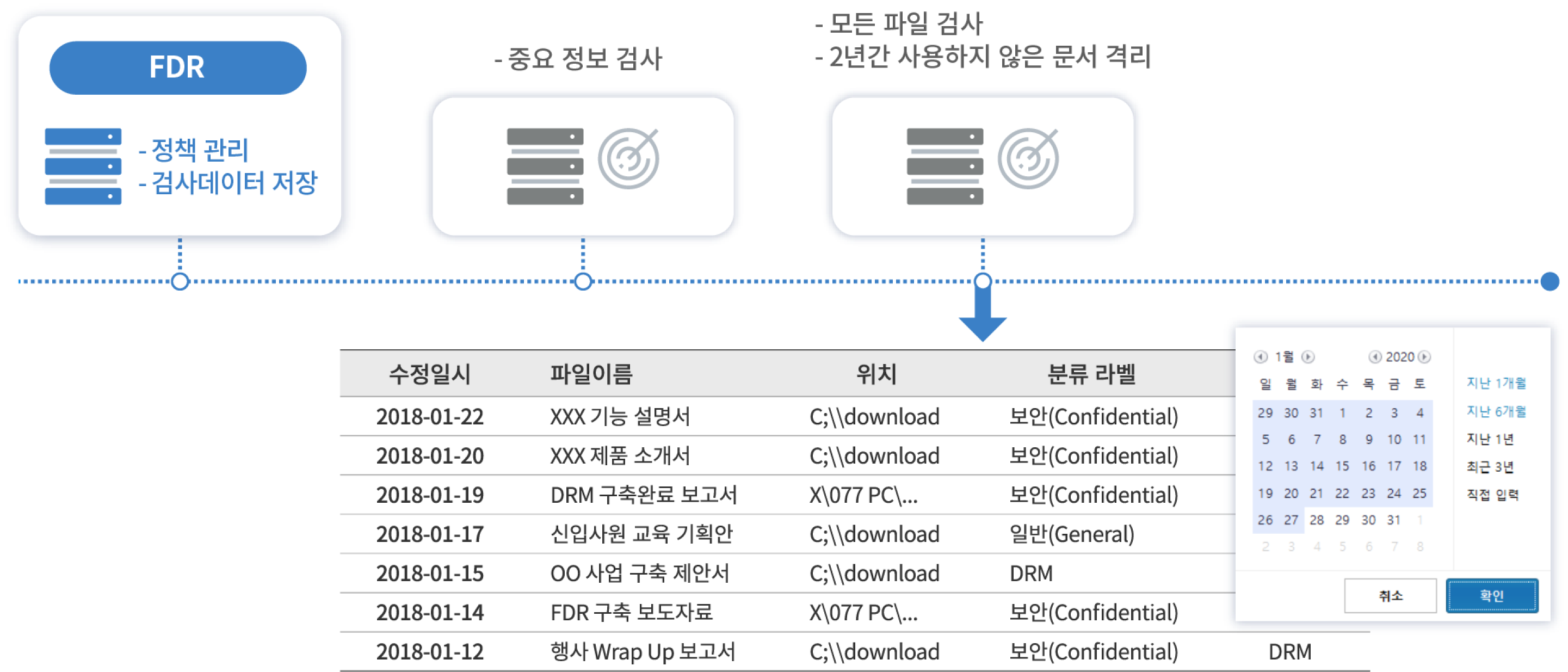 PC 또는 서버에 어떤 데이터가 얼마나 저장돼 있는지 파악하고 데이터 성격에 따라 자동 분류한 후, 검출 데이터에 대한 보호, 삭제, 분류, 태그 설정이 가능해야 합니다.