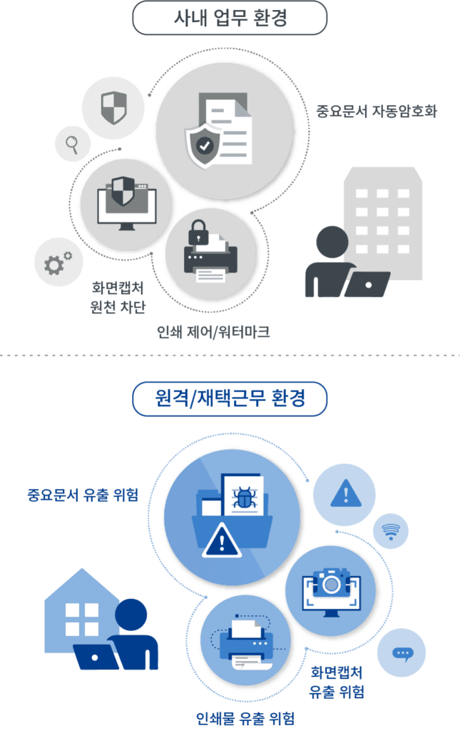 정보 유출 사각지대인 인쇄 영역에서 중요 정보 검출 기준은 물론 사용자의 근무 환경에 따라 허용, 차단, 결재 후 인쇄 등 출력 제어 및 사용자의 세부 정보를 포함한 출력물 워터마크를 삽입해 출력물을 통한 중요 정보 유출을 예방합니다.
