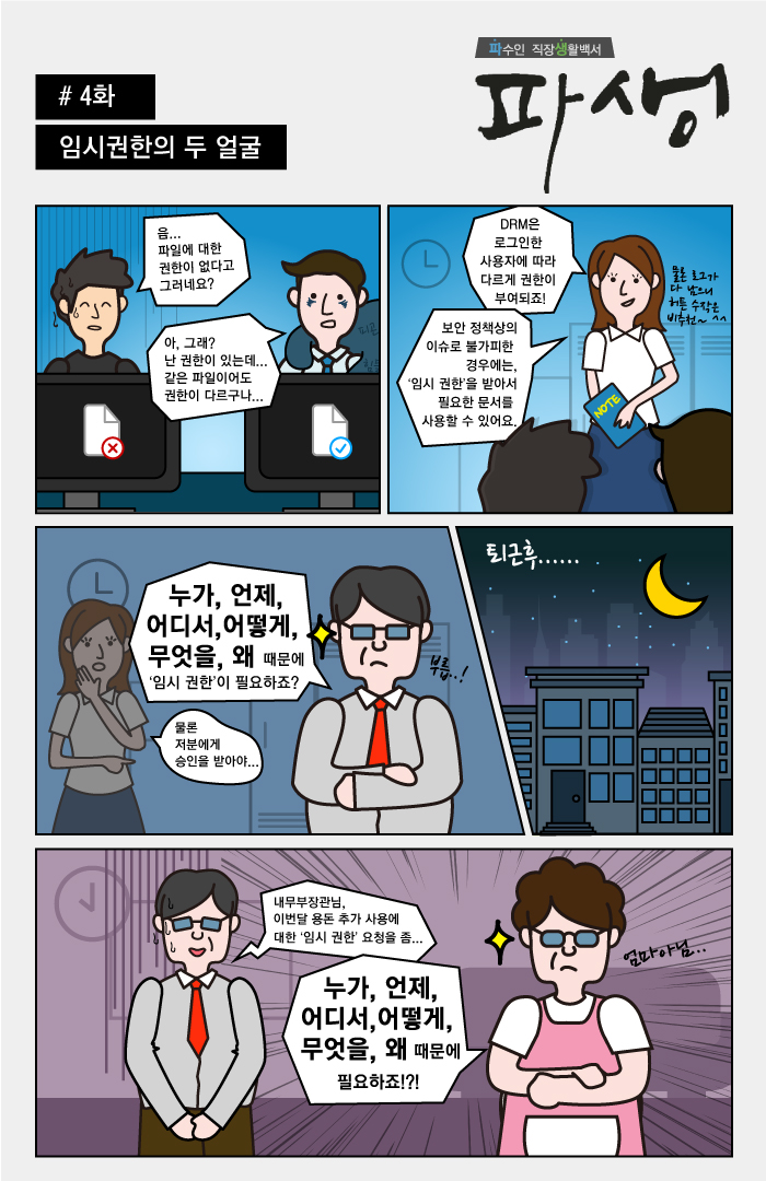 Fasoo에서 자체적으로 기획하고 그린 ‘보안 웹툰’ 서비스 웹툰 시리즈: 파생 | 임시권한의 두얼굴 | 날짜: 2017년 6월 5일