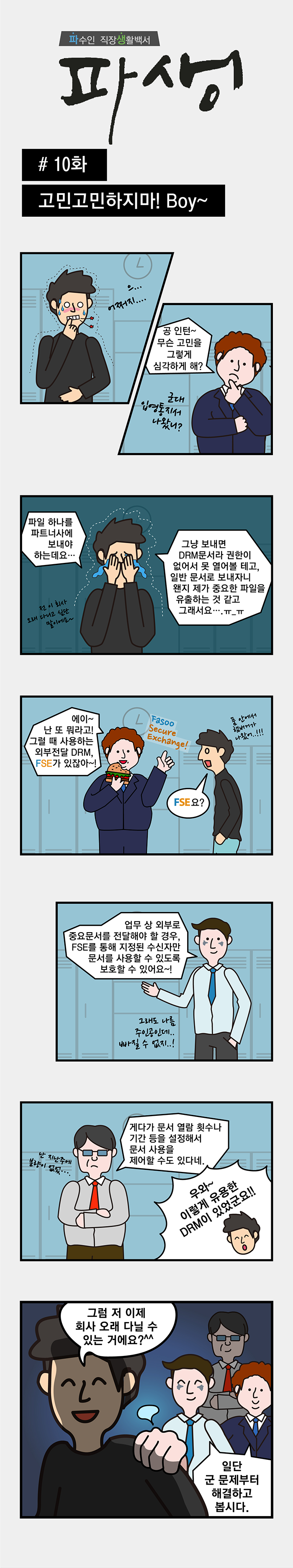 Fasoo에서 자체적으로 기획하고 그린 ‘보안 웹툰’ 서비스 웹툰 시리즈: 파생 | 고민고민하지마! Boy~ | 날짜: 2017년 8월 16일